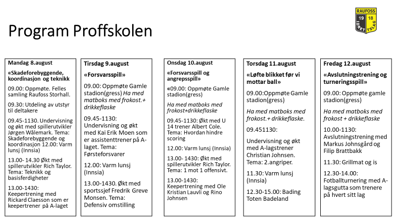 Proffskolen er en del av Raufoss Fotballskole del 2 og avholdes fra mandag 8. til fredag 12. august. Akademisjefen Thomas Andersen fyller på med noen av de aller beste trenerne vi har i klubben denne uka, og har satt sammen et supert program! Sjekk det ut, og husk å melde på! Fotballskolen