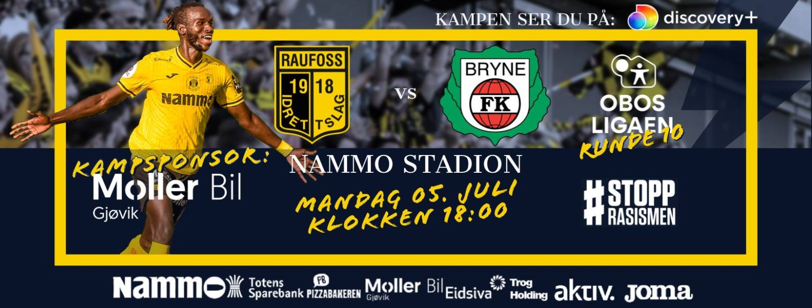 I den 10. serierunden tar vi imot Bryne FK på Nammo Stadion. Det er fem år siden sist rødtrøyene gjestet Raufoss. Kampstart på mandag er kl. 18.00. a-laget OBOS-ligaen