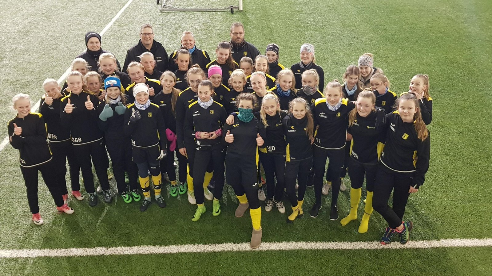 På mandag var de hele 55 jenter som møttes til fellestrening i Raufoss Storhall. Onsdag kveld var de noen færre, men med like god stemning. Treningene blir ledet av trenere fra junioravdeling som er trenere på jente og damelag i klubben. Det er (fra venstre bak i bildet) Vetle Vangstuen, Bjørn Aspelien, Thomas Nauf Johansen og Øystein Amlien. Adrian Lund er også involvert i dette initiativet.