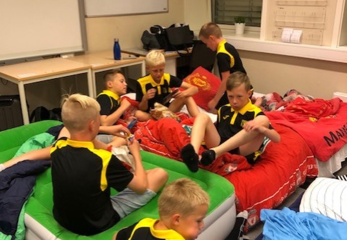 Det var også med mange foreldre. Disse ble innlosjert i hytter, bobiler, campingvogner og hotell. Gutta skulle bo på skole.