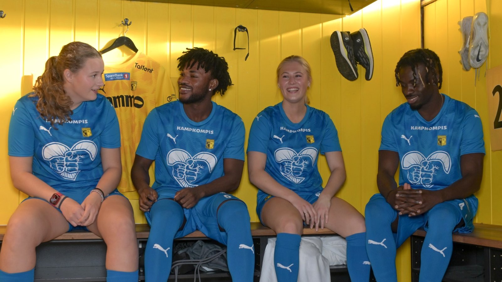 A-lagsspillerne Madikken Løvlien Sagbakken, Yaw Agyeman, Pamina Strand og Kebba Badjie stilte alle velvillig opp til foto-shoot for å markere støtte til Kampkompis. (Foto: Marius Mykleset)
