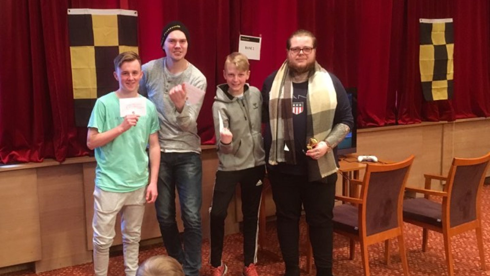 Kristoffer Strand gikk seirende ut av vår aller første FIFA 19- turnering. Han slo ut storfavoritten Lars Olsen i finalen i Fyrverkeriet i ettermiddag. Kristoffer er like teknisk god med spillkonsollen som han er på fotballbanen for vårt U19-lag. Fra venstre i bildet: Kristoffer Strand, Lars Olsen, Heine Hoel og Henrik M. Martinsen Esport/ Eserien
