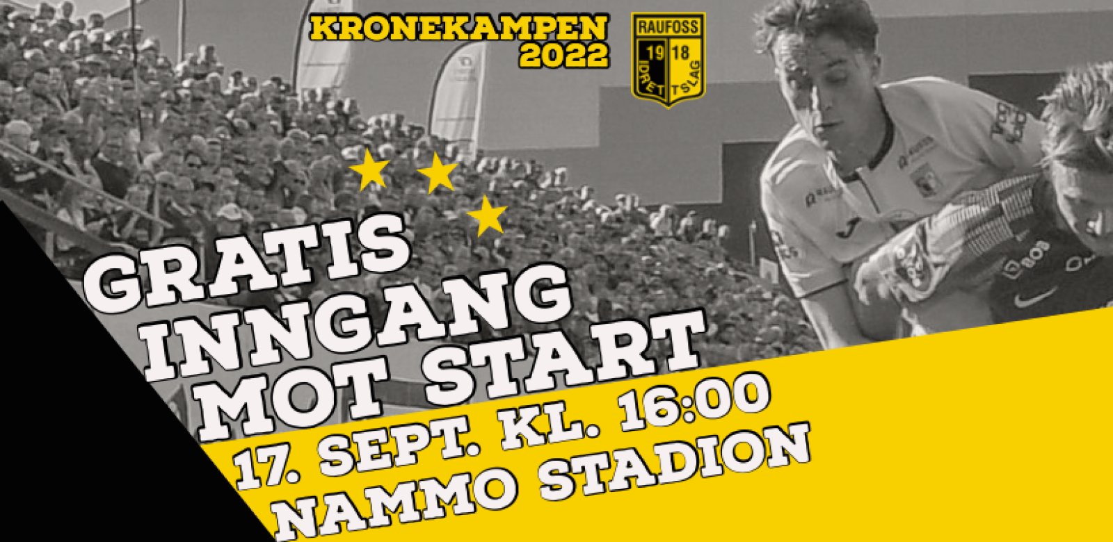 I samarbeid med næringsliv og privatpersoner inviterer Raufoss Fotball til gratis inngang for alle når IK Start gjester Nammo Stadion 17. september kl. 16.00. Det blir masse liv og røre på stadion hele denne dagen, og opptakten blir det norske U15-landslaget jenter som møter Danmark på stadion fra kl. 11.30.