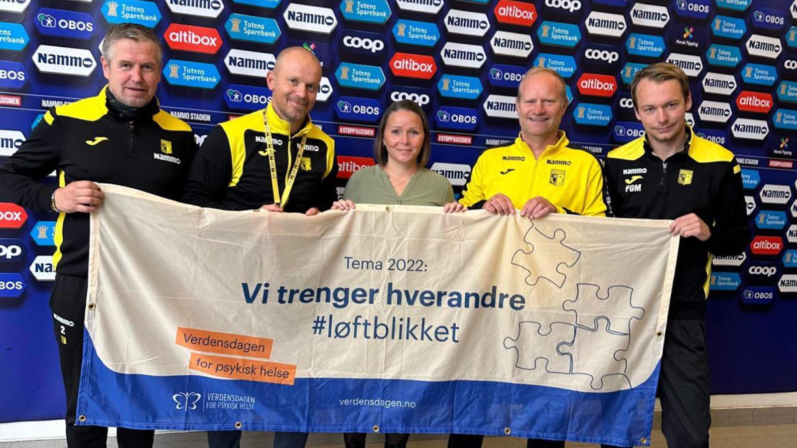Det er i år 30-års jubileum for markeringen av Verdensdagen for psykisk helse, og 10.oktober ble valgt som den internasjonale dagen for markeringen. Bildet: Tore Nestaker, Mathias Engebakken, Liss Pedersen, Kenneth Karlsen og Fredrik Greve Monsen forener krefter for fokus på psykisk helse og helsefremmende møter mellom mennesker i Raufoss Fotball. Hele klubben