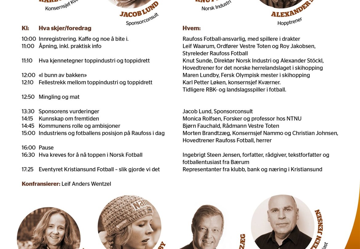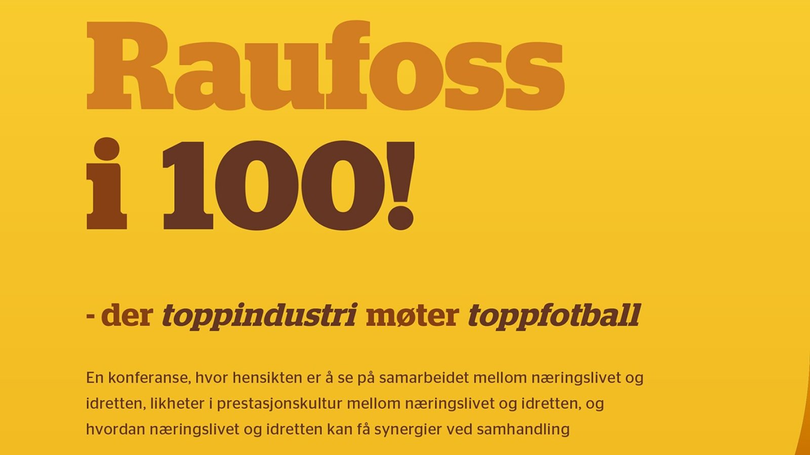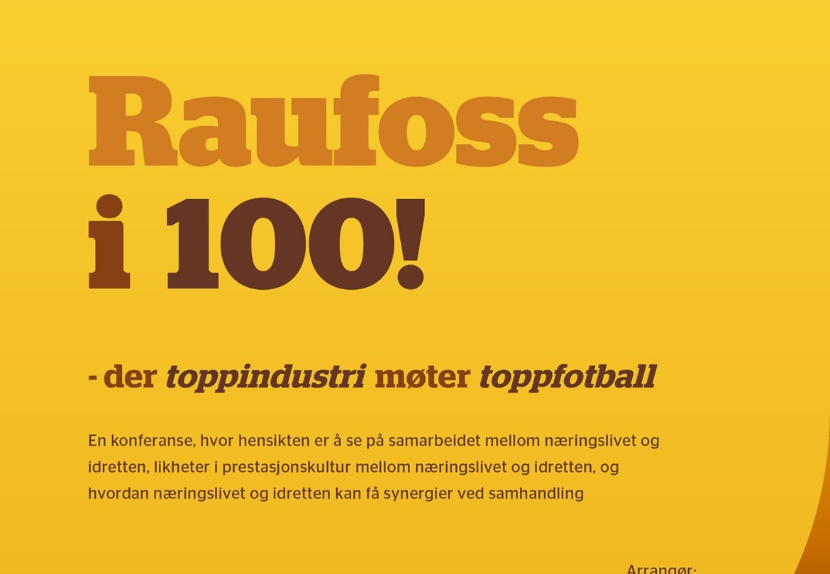 Mandag 1. oktober arrangeres konferansen Raufossi100 i Fyrverkeriet kulturhus, med undertittelen: "toppindustri møter toppfotball". Programmet er spekket med spennende foredragsholdere! arrangement Raufossi100