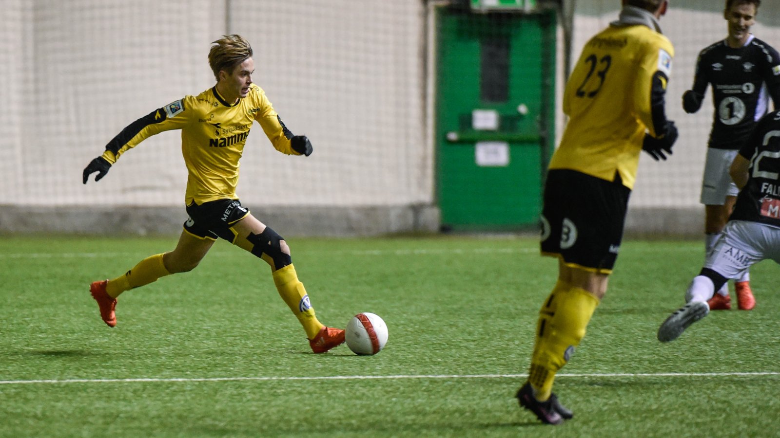 Kampen startet bra for gultrøyenes del. Prøvespillere var det fire av på banen fra start: Stian Simenstad og Snorre Strand Nilsen (sist sett i Gjøvik-Lyn), Sebastian Andersson (sist sett i Aalesund) og Nemrut Awrohum (sist sett i Brommopojkarna).
