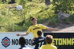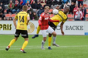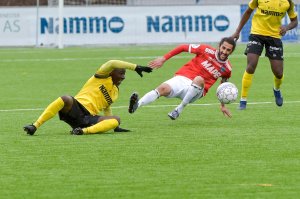 Det ble mange dueller mellom Solo Owusu og Adem Guven på Nammo Stadion i kveld. Solo gikk seirende ut av de aller fleste. Kampen endte 0-0 men bød på god valuta for inngangspengene for de 1000 på tribunene.