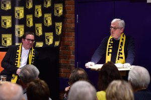Gjennom jubileumsåret skal vi avholde flere arrangement, og onsdag 4. april inviterer vi til sportsquiz på Retro Bar. Hovedtema for quizen vil naturlig nok være 100 år med Raufoss Idrettslag. På bildet ser vi Terje Solbakken og Arne Halvorsrud med den "store kloke boken" under Fotballsalongen i kulturhuset 7. februar.
